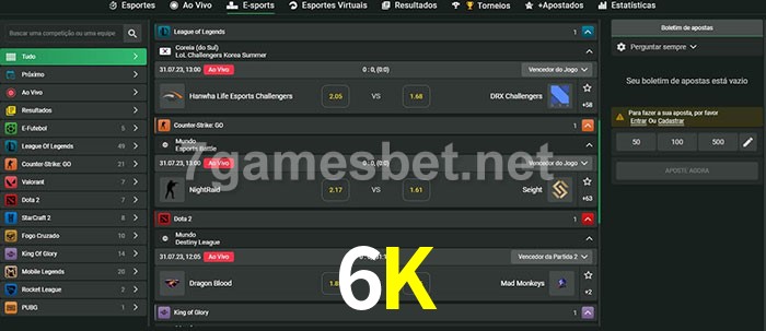O 6K oferece uma grande seleção de opções de apostas em e-sports com probabilidades competitivas